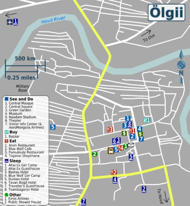 There is a daily bus from Ulaanbaatar (at least 30 hours on mostly paved roads) costing 80,000 ₮. It leaves from UB from the Dragon Center in UB, and to UB from a lot south of the city center on the road to Hovd in Ölgii. Bus to Kazakhstan leaves every 10 days, and cost US$100 to Astana. You need to get a visa in UB first. Tickets can be bought in the basement of the west wing of the theater building. Buses leave for UB daily at exactly 15:00. There are shared jeeps daily to and from Hovd. These are cheap, but very overcrowded. They leave from the Bazaar in Ölgii and Black Market in Hovd. Times depend on the driver. Travel time is roughly 8 hours, with a stop around halfway for dinner of buuz and hoshuur (steamed mutton dumplings and fried mutton pancakes). Price of shared jeep to Hovd is 20,000 ₮.Get around