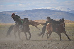 Altai Kazakh Eagle FestivalThis smaller eagle festival usually has 30 to 40 eagles and their horse-mounted masters. The event is held over 2 days and features displays of skill by the trained eagles, traditional Kazakh horse games such as a camel race, kokpar, Tiyn Teru, and Kyz Kuar. The event has handicrafts, food, and gers to stay in.