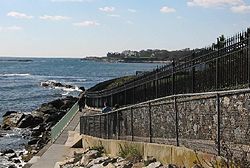 Famous Cliff WalkDedicated in 1975, this 3.5 mi. (5.6 km) public access walkway is a beautiful walk, and two-thirds of the trail is easy walking for all ages. The cliff walk offers some of the most beautiful views existent in New England, and wildlife can be seen everywhere throughout the walk. The Cliff Walk offers beautiful ocean views and, since it is located in a national historic district, offers a peek at the famous Newport Mansions. The walking trail starts at Newport's First Beach and follows the coast up to the island's Ocean Drive. While walking, watch out for poison ivy. Some portions of the Cliff Walk drop off steeply into the water, so proceed and pass other walkers at your own risk. Rocks can be slippery, and parts of walk are not well paved, so wear proper footwear. The Cliff Walk can take from 2 to 4 hours, depending on how fast you walk. While bikes are not permitted, dogs are as long as they are kept on a leash. The Cliff Walk does not offer refreshments or picnic areas, so be sure to eat, or pack light snacks like granola bars. The Cliff Walk's hours are from sunrise to sunset and the attraction is completely free of charge. The north end is handicapped accessible and baby carriage accessible. There are multiple ways to exit the Cliff Walk, all of which lead back to Bellevue Avenue and the front side of the mansions. Walking back to the car can take a while, so the free RIPTA trolley is a viable option to get back to your vehicle.