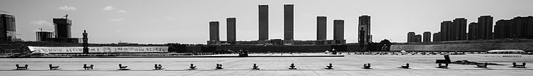 Ordos (Kangbashi) is bounded by the Wulan Mulun River to its south. On the opposite bank of this river is the town of Altan Xire (阿勒腾席热镇), the county seat of Ejin Horo Banner and the central business district extension of Kangbashi. While the architecture in Altan Xire is not as sleek as the futuristic civic buildings in Kangbashi, the highly urbanized town hosts an impressive complex of skyscrapers along the river and several other tall commercial and residential high rises throughout the town. These tall buildings all emanate a flashing electric light show at night, as do the buildings in Kangbashi.