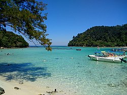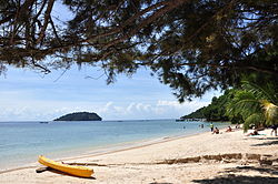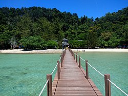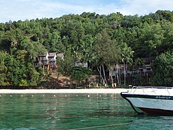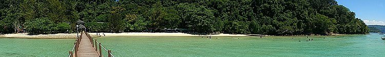 ManukanOne of the most developed islands in the Tunku Abdul Rahman Marine Park due to its 1-km stretch of white sandy beach and pine-tree lined shores. Sutera Sanctuary Lodges have expensive beach and hill-side chalets here for rent, as well as a covered restaurant and a daily beach BBQ buffet spread. Other facilities include a snorkelling equipment rental hut, a small sundry shop, changing rooms. toilets and Scubadoo underwater scooters. Life guards are on duty on the main beach where there are also wooden tables and chairs for picnics. During the holiday season the island can get quite crowded, but makes for interesting people watching. Shallow water corals have all but been destroyed by stampeding holiday makers, but in deeper water and near the jetty area there are still vibrant fish life to be found. For those interested in hiking, there is a 1.5-km "jungle trek" paved walking path which starts from the base of the dock, and leads hikers through the forest to the opposite end of the island. From the end, you can either turn back or clamber down an unmarked path to the beach below. It is possible to walk along the south side of the island all the way back to the dock and the main beach if you don't mind climbing over a lot of rocks (accessibility may depend on the tides; use your best judgment).